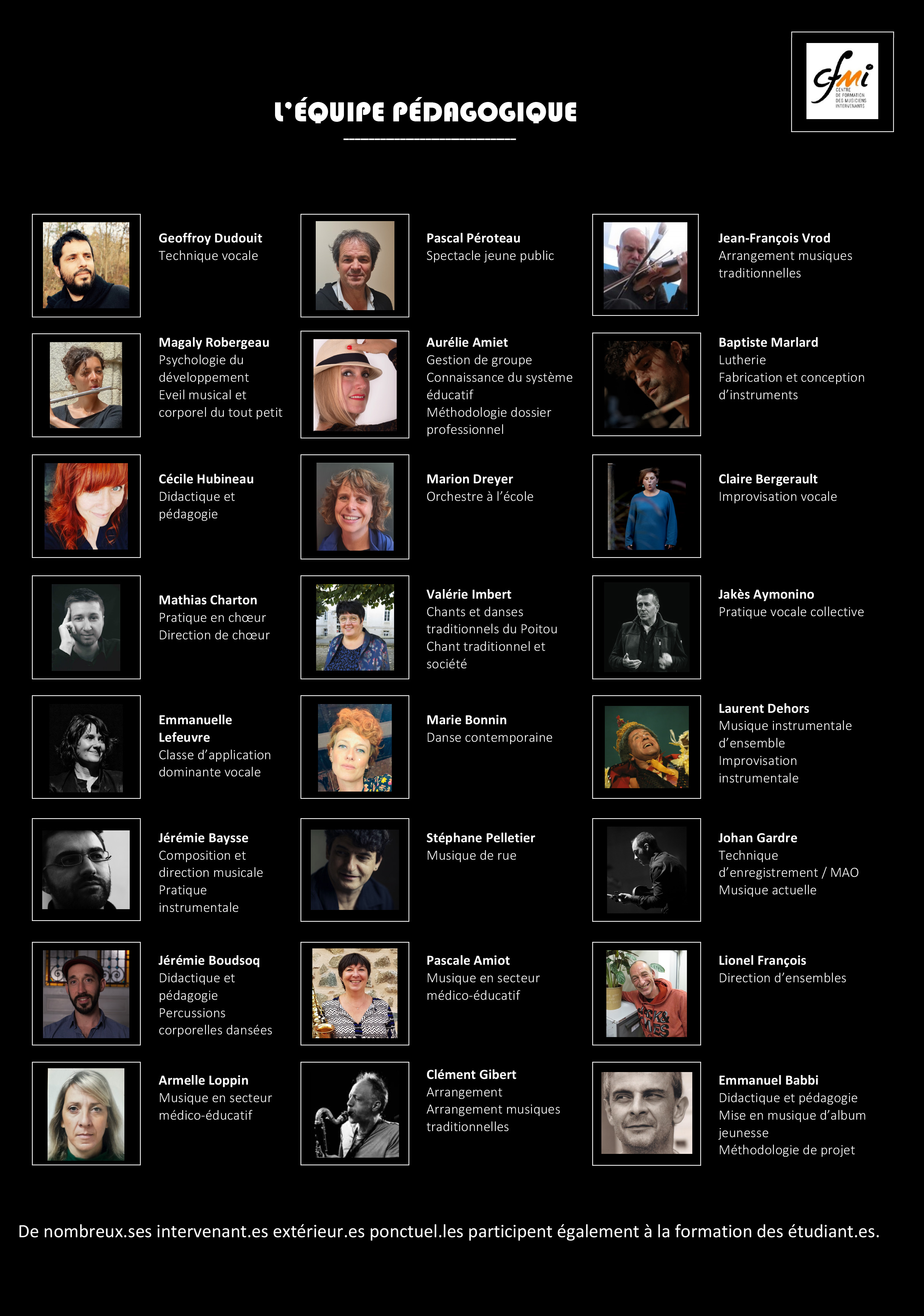 L’équipe pédagogique est complétée par des intervenant.es ponctuel.les présentant les institutions (DRAC, Education Nationale, CNFPT, PESMD, TAP, JMFrance, FNAMI,…) et des aspects spécifiques du métier de musicien intervenant.