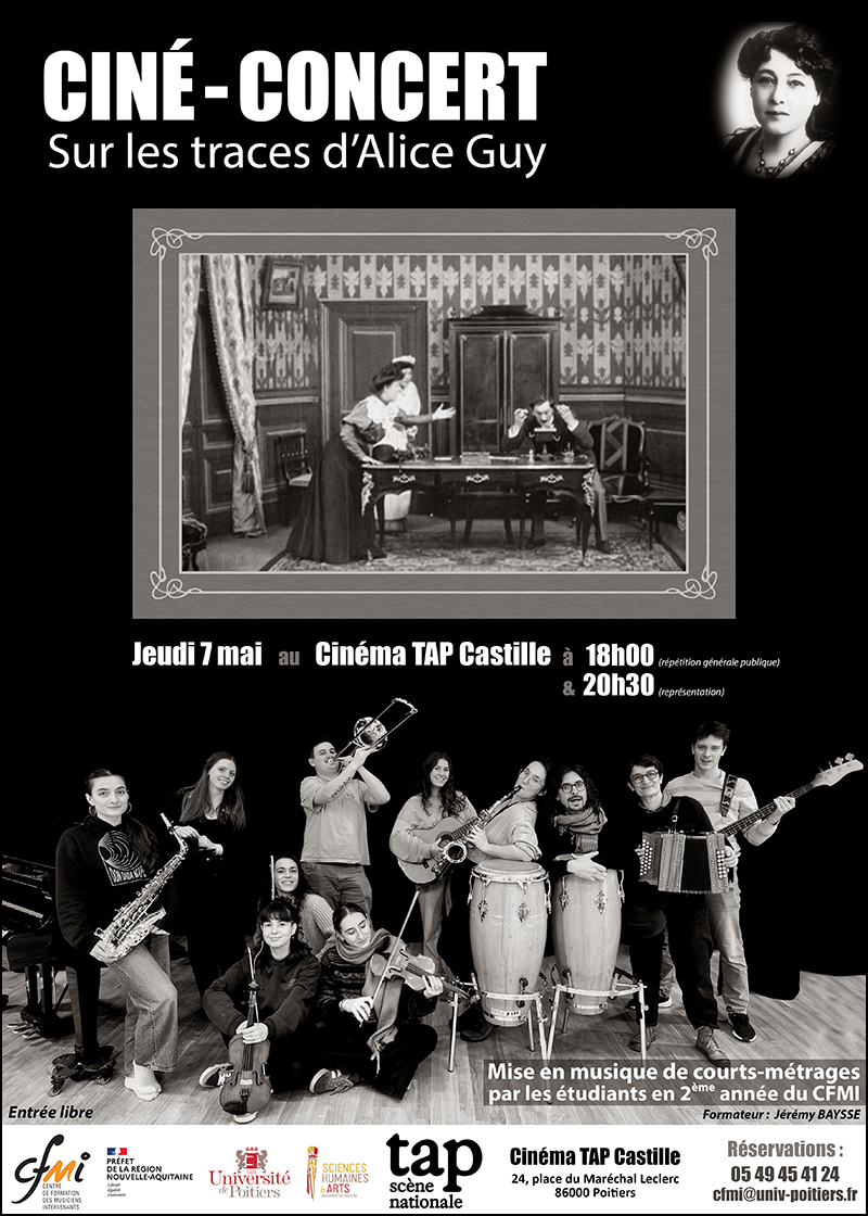 Rendez-vous jeudi 7 mai au Tap Cinéma pour une mise en musique de courts métrages sur les traces d’Alice Guy par les étudiants en 2ème année de formation au CFMI Poitiers, encadrés par Jeremy Baysse.