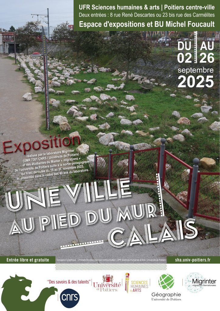 L’exposition « Une ville au pied du mur, Calais » a été réalisée à partir des photographies prises à Calais par des chercheurs et des étudiantes de seconde année du master Migrations*, formation adossée à l’unité de recherche Migrinter (Université de Poitiers / CNRS), lors de la sortie pédagogique qui s’est déroulée du 19 au 26 novembre 2023.