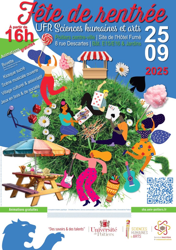 L’équipe de direction de l’UFR Sciences humaines et arts, associée aux services Communication & Insertion, est heureuse d’inviter ses étudiant.e.s et son personnel à la fête de rentrée qui aura lieu au centre-ville de Poitiers, sur le site de l’Hôtel Fumé (bâtiments E15, E16 et jardins – 8 rue René Descartes, Poitiers) le jeudi 25 septembre à partir de 16h.