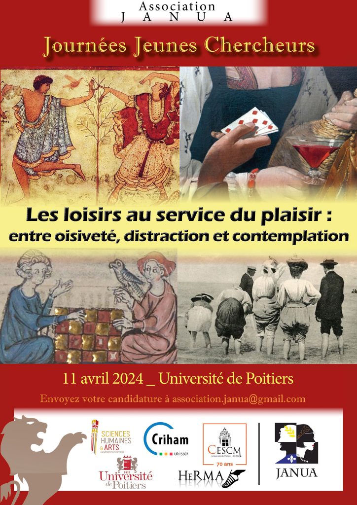 Chaque année, l’association des jeunes chercheuses et chercheurs inscrits en Master et en Doctorat en Sciences Humaines et Arts à l’Université de Poitiers (JANUA), organise une journée d’études. Cette journée interdisciplinaire, ayant vocation à valoriser les travaux de jeunes chercheurs (étudiants de Master 2, doctorants et post-doctorants), portera cette année sur la thématique des loisirs.