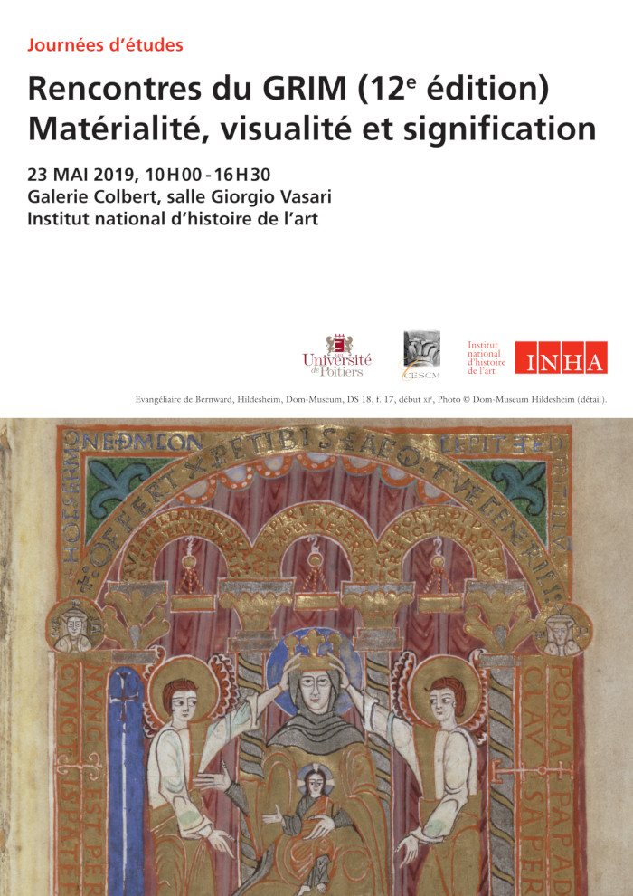 Le GRIM – Groupe de recherches en iconographie médiévale – est un collectif académique fondé par Christian Heck, qui s’intéresse à l’analyse et l’interprétation des œuvres médiévales ainsi qu’aux corpus et bases d’images qui les rendent possibles. Dorénavant lié à IMAGO et favorisant la prise de parole de jeunes chercheurs, il organise sa 12e journée d’études sur le thème Matérialité, visualité et signification.