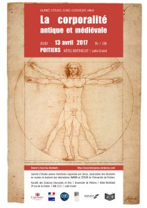 Janua, association des étudiants en Master et des doctorants de l’Université de Poitiers antiquisants et médiévistes, rattachés respectivement aux laboratoires HeRMA (Hellénisation et Romanisation dans le Monde Antique) et CESCM (Centre d’Études Supérieures de Civilisation Médiévale), organise le 13 avril 2017 une journée d’étude à destination des jeunes chercheurs (étudiants en Master Recherche, doctorants, docteurs ayant soutenu depuis moins de trois ans). Le thème retenu cette année est celui de la corporalité, entendue au sens large : qu’elle soit personnelle ou collective, matérielle, spirituelle, liée à la nomenclature des gestes, à la question des comportements, à l’idée de norme, etc.